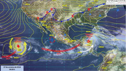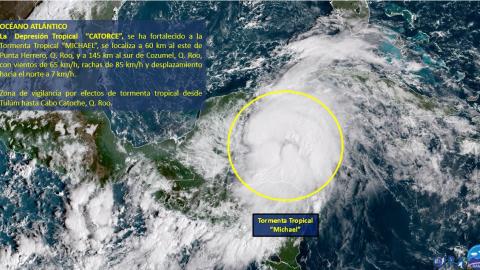 Se prevé el ingreso de un sistema frontal al noroeste y norte de México, el cuál ocasionará el desarrollo de nubes de tormenta con rachas de viento que pueden superar los 60 km/h en ambas regiones, así como posibles tolvaneras o torbellinos en Chihuahua y Coahuila. Por otro lado, la Depresión Tropical "Catorce", se localizará aproximadamente a 100 km al este de la costa de Quintana Roo, esperándose alcance la categoría de tormenta tropical durante este día y llevaría el nombre de "Michael", ocasionará tormentas muy fuertes a puntuales intensas en la Península de Yucatán, así como vientos fuertes con rachas de hasta 60 km/h y oleaje de 2 a 3 metros de altura en zonas costeras. Finalmente, inestabilidad atmosférica superior afectará el occidente y sur del país, dichos sistemas ocasionarán el siguiente potencial de lluvias, las cuales estarán acompañadas de actividad eléctrica y posibles granizadas.